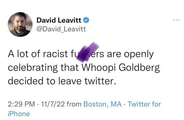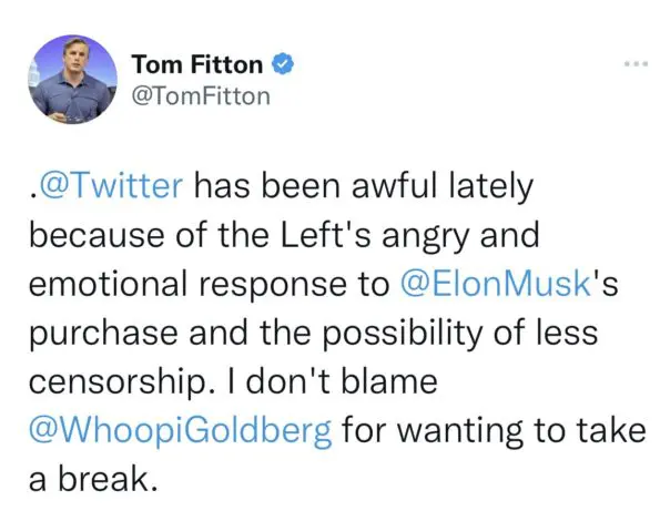 “@Twitter has been awful lately because of the Left’s angry and emotional response to @ElonMusk‘s purchase and the possibility of less censorship. I don’t blame @WhoopiGoldberg for wanting to take a break.”
