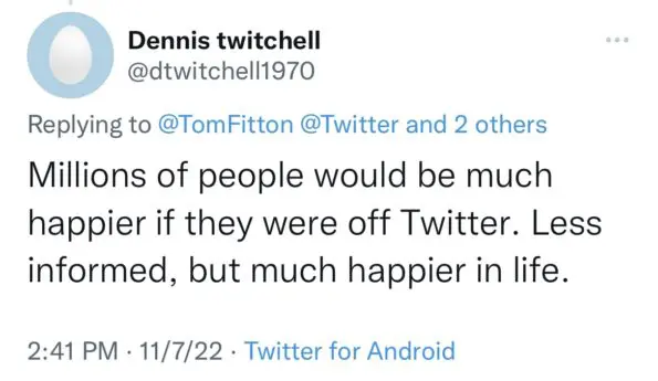 “It’s been a little over a week since Elon Musk took over Twitter and this place is a mess. I’m getting off today because I just feel like it’s so messy, and I’m tired of now having certain kinds of attitudes blocked now getting back on. So I’m gonna get out, and if it settles down enough and I feel more comfortable maybe I’ll come back. But as of tonight, I’m done with Twitter.”