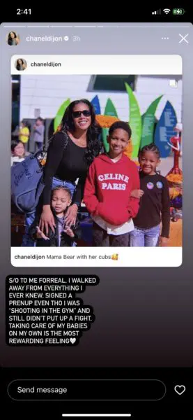 “S/O TO ME FORREAL, I WALKED AWAY FROM EVERYTHING I EVER KNEW, SIGNED A PRENUP EVEN THO I WAS “SHOOTING IN THE GYM” AND STILL DIDN’T PUT UP A FIGHT. TAKING CARE OF MY BABIES ON MY OWN IS THE MOST REWARDING FEELING”