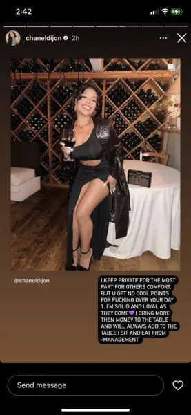 “I KEEP PRIVATE FOR THE MOST PART FOR OTHERS COMFORT. BUT U GET NO COOL POINTS FOR F*CKING OVER YOU DAY 1. I’M SOLID AND LOYAL AS THEY COME I BRING MORE THEN MONEY TO THE TABLE AND WILL ALWAYS ADD TO THE TABLE I SIT AND EAT FROM – MANAGEMENT”
