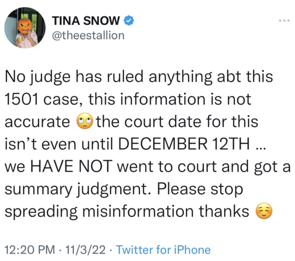 “No judge has ruled anything abt this 1501 case, this information is not accurate the court date for this isn’t even until DECEMBER 12TH … we HAVE NOT went to court and got a summary judgment. Please stop spreading misinformation thanks.”