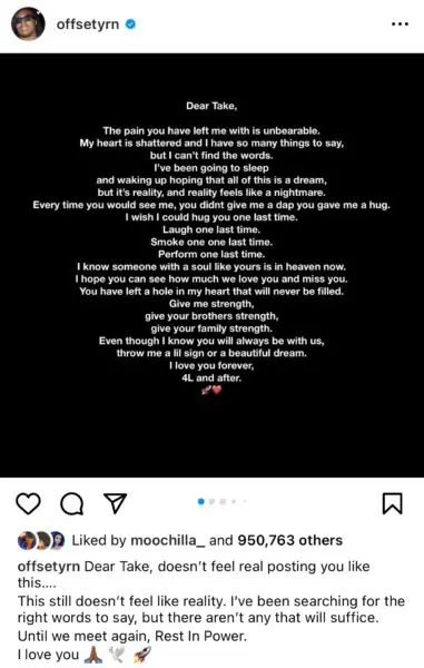 “Dear Take, The pain you have left me with is unbearable. My heart is shattered and I have so many things to say, but I can’t find the words. I’ve been going to sleep and waking up hoping that all of this is a dream, but it’s reality, and reality feels like a nightmare.”