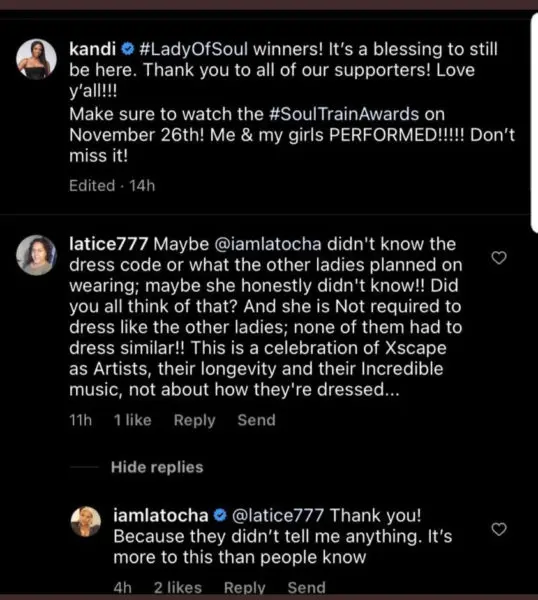 Real Housewives of Atlanta star and fellow Xscape group member Kandi Burruss also shared a post of her group’s red carpet appearance online while thanking her fans for their support. Despite the post being nothing but positive, things took a left turn in the comment section.