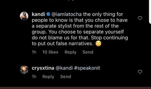 It didn’t take long before Kandi Burruss caught wind of the comments and decided to share her side of things. In response to her group member, Kandi said,