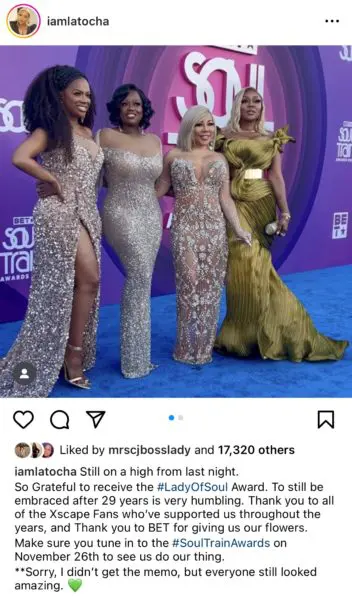 “Still on a high from last night…So Grateful to receive the #LadyOfSoul Award. To still be embraced after 29 years is very humbling. Thank you to all of the Xscape Fans who’ve supported us throughout the years, and Thank you to BET for giving us our flowers. Make sure you tune in to the #SoulTrainAwards on November 26th to see us do our thing.”