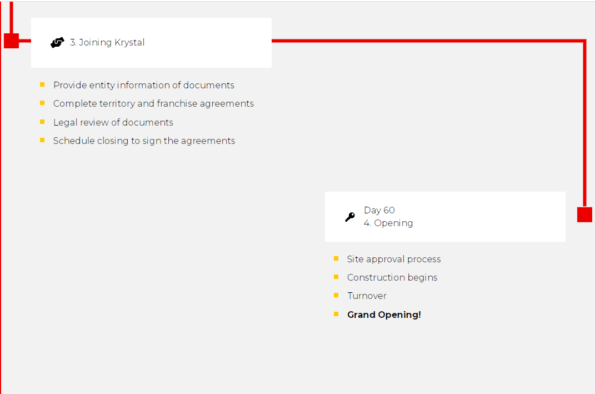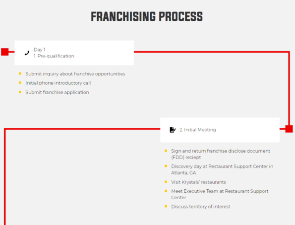 According to the Krystal website, if someone wants to become a franchise owner they must complete the pre-qualification process, an initial meeting, finalize all the requirements of joining the team, and lastly, by day 60, secure the essential steps to open as part of the franchise owner criteria.