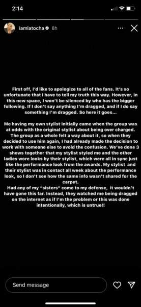“First off, I’d like to apologize to all of the fans. It’s so unfortunate that I have to tell my truth this way. However, in this new space, I won’t be silenced by who has the bigger following. If I don’t say anything I’m dragged, and if I do say something I’m dragged. So here it goes… Me having my own stylist initially came when the group was at odds with the original stylist about being over charged.”