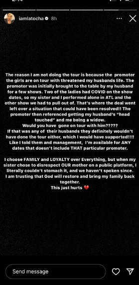 “The reason I am not doing the tour is because the promoter the girls are on tour with threatened my husbands life. The promoter was initially brought to the table by my husband for a few shows. Two of the ladies had COVID on the show dates, so my sister and I performed alone in ATL and the other show we had to pull out of. That’s where the deal went left over a situation that could have been resolved!!”