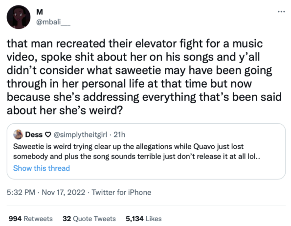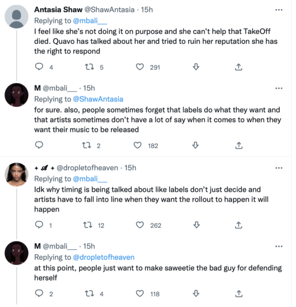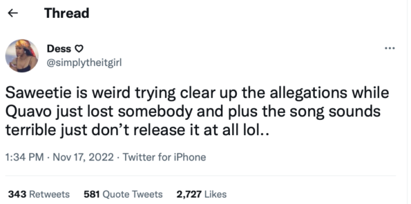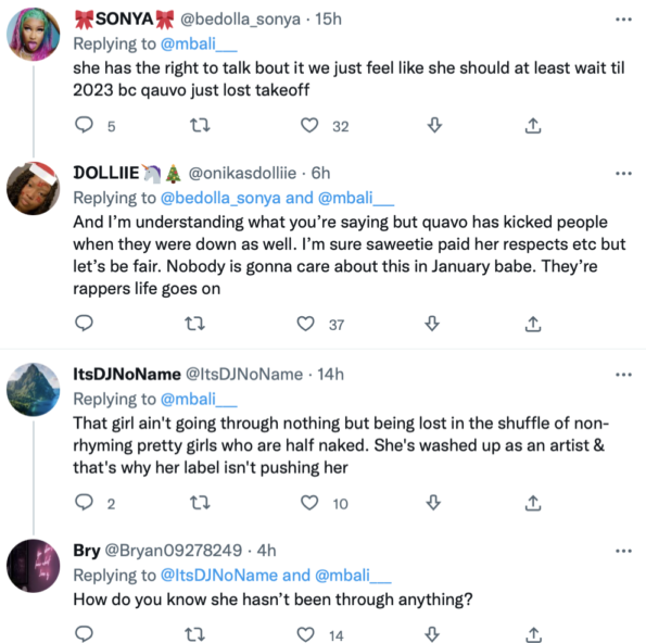 Despite seemingly dissing her first, some music listeners feel that Saweetie’s response came at the wrong time. Mainly because Quavo appears to still be grieving the loss of his nephew/group member Takeoff, who was fatally shot in Houston on Nov. 1. However, others seem to be supporting the song, claiming Saweetie “has a right” to talk about their breakup drama too.