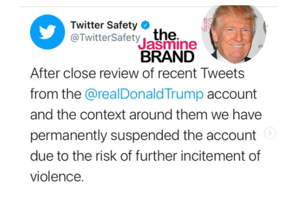 “After close review of recent Tweets from the @realDonaldTrump account and the context around them we have permanently suspended the account due to the risk of further incitement of violence.”