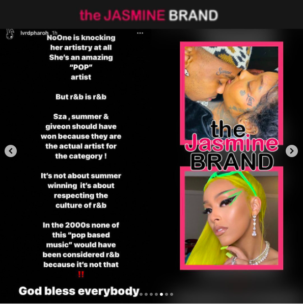 Following Doja Cat’s victorious night at the Billboard Music Awards in May, Summer Walker’s now ex-boyfriend questioned why the “Get Into It” rapper was placed in multiple R&B categories. Summer was also nominated in the same R&B categories as Doja Cat. LVRD Pharoh shared posts via his IG stories calling out the BBMAs and seemingly taking a few shots at Doja Cat as well. He said,