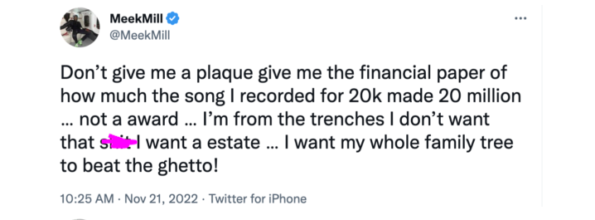 “Don’t give me a plaque give me the financial paper of how much the song I recorded for 20k made 20 million … not a award … I’m from the trenches I don’t want that sh*t I want a estate … I want my whole family tree to beat the ghetto!”