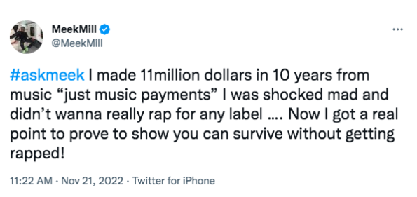 Meek shared his frustrations over the fact that he only earned $11 million from his musical endeavors over a 10-year period.