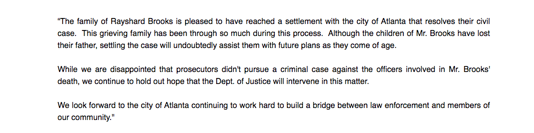 “The family of Rayshard Brooks is pleased to have reached a settlement with the city of Atlanta that resolves their civil case. This grieving family has been through so much during this process. Although the children of Mr. Brooks have lost their father, settling the case will undoubtedly assist them with future plans as they come of age,”