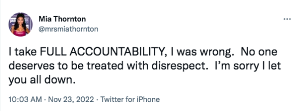 On Wednesday (Nov. 23), “RHOP” star Mia Thornton took to Twitter with a message after taking down her account. She wrote:
