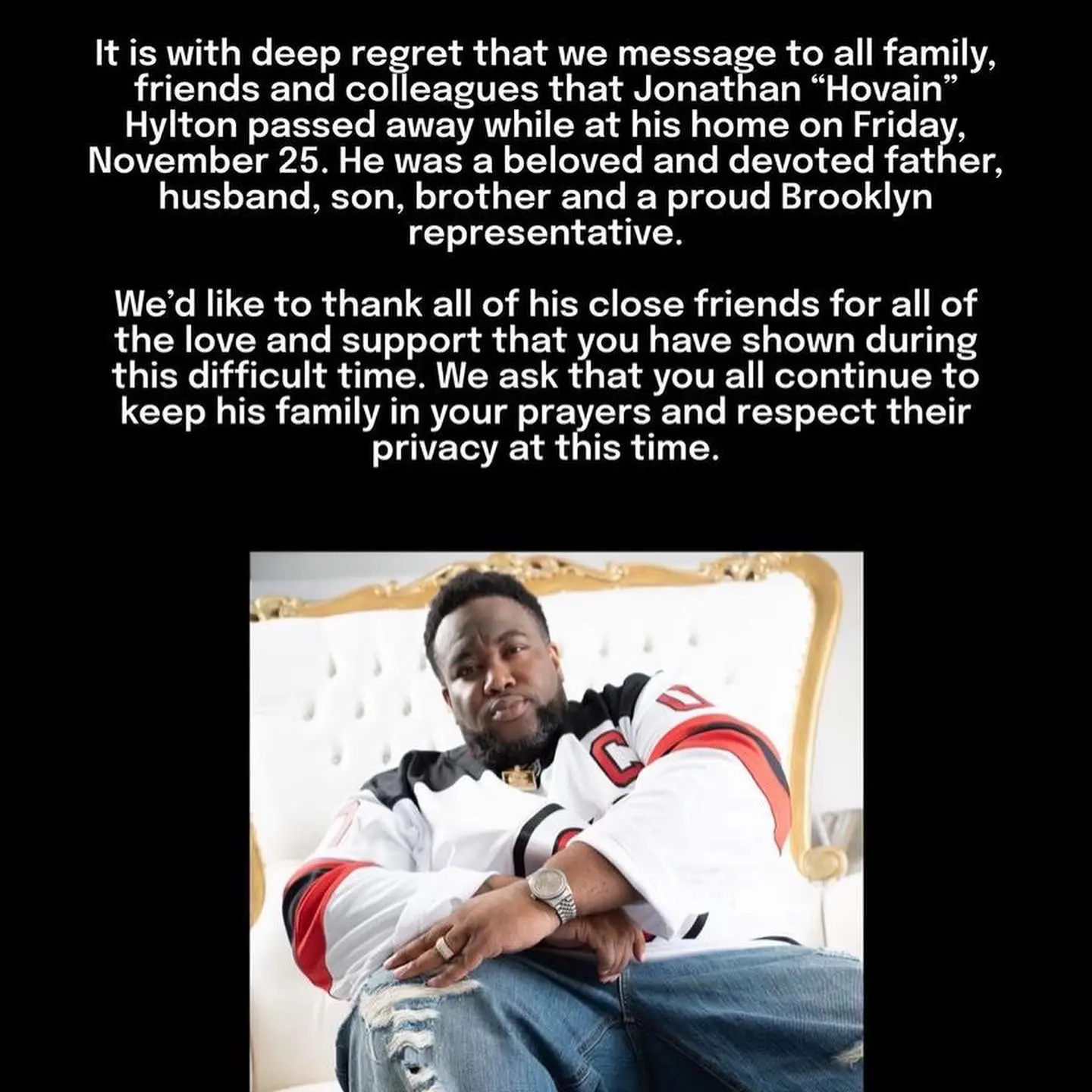 “It is with deep regret that we message to all family, friends, and colleagues that Jonathan ‘Hovain’ Hylton passed away while at his home on Friday (Nov. 25). He was a beloved and devoted father, husband, son, brother, and a proud Brooklyn representative. We’d like to thank all of his close friends for all of the love and support that you have shown during this difficult time. We ask that you all continue to keep his family in your prayers and respect their privacy at this time.”