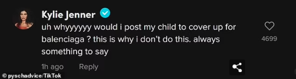 Kim added that she was “reevaluating” her future with the company based on their “willingness to accept accountability.” Though the 42-year-old denounced Balenciaga’s actions, many still criticized her response for not completely cutting ties with the brand. Apparently, the TikTok user psychadvice, who seemingly got under Kylie’s skin, is one Kim’s critics. The user reposted Kylie and Kim’s subsequent photos, writing: