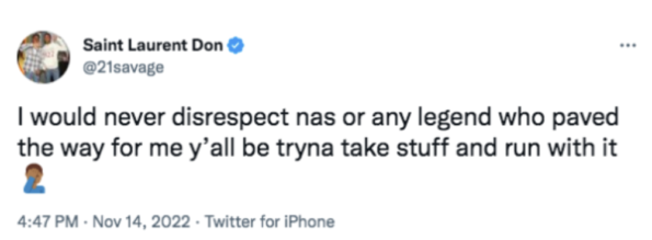 https://twitter.com/HipHopEsp_/status/1592174531753672704?ref_src=twsrc%5Etfw%7Ctwcamp%5Etweetembed%7Ctwterm%5E1592174531753672704%7Ctwgr%5E9afe7d7f34933fb6e7a18bced658181b02b2a323%7Ctwcon%5Es1_&ref_url=https%3A%2F%2Fthejasminebrand.com%2F2022%2F11%2F15%2F21-savage-doesnt-think-nas-is-relevant-anymore-he-just-has-a-loyal-a-fanbase%2F