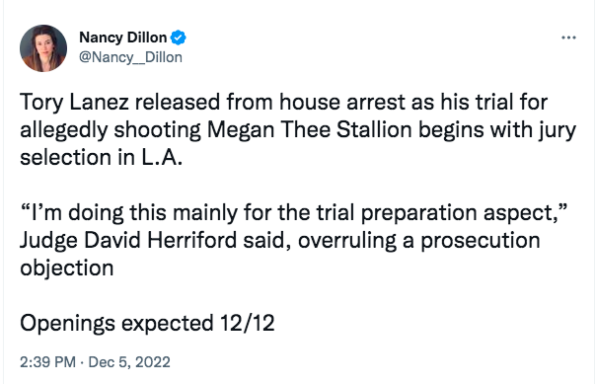 Tory was taken off house arrest yesterday (Dec. 5) “as his trial for allegedly shooting Megan Thee Stallion begins with jury selection in L.A.”