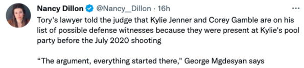 “Tory’s lawyer told the judge that Kylie Jenner and Corey Gamble are on his list of possible defense witnesses because they were present at Kylie’s pool party before the July 2020 shooting…’The argument, everything started there,’ George Mgdesyan says”