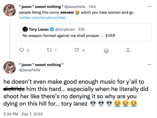 “he doesn’t even make good enough music for y’all to d*ckride him this hard… especially when he literally did shoot her like there’s no denying it so why are you dying on this hill for… tory lanez”
