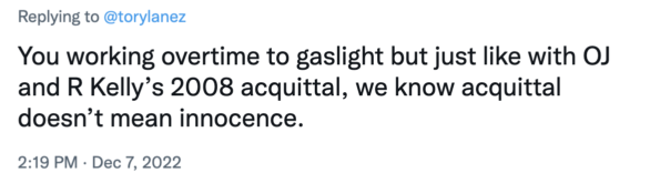 “You working overtime to gaslight but just like with OJ and R Kelly’s 2008 acquittal, we know acquittal doesn’t mean innocence.”