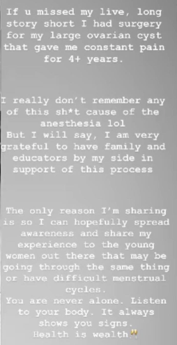 “If you missed my live, long story short I had surgery for my large ovarian cyst that gave me constant pain for 4+ years. I really don’t remember any of this sh*t cause of the anesthesia lol But I will say, I am very grateful to have family and educators by my side in support of this process.”