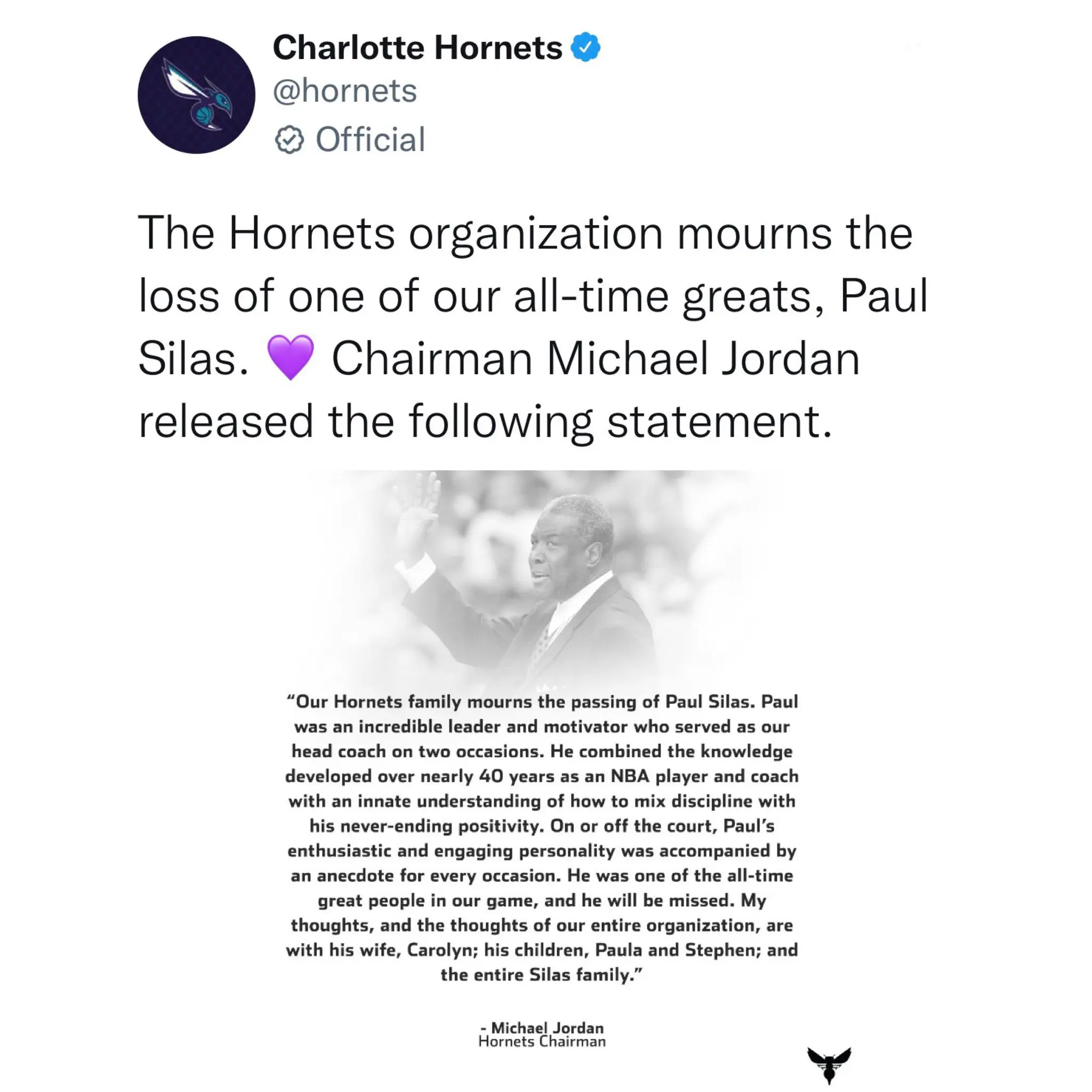“Our Hornets family mourns the passing of Paul Silas. Paul was an incredible leader and motivator who served as our hed coach on two occasions. He combined the knowledge developed over nearly 40 years an an NBA player and coach with an innate understanding of how to mix discipline with his never-ending positivity.”