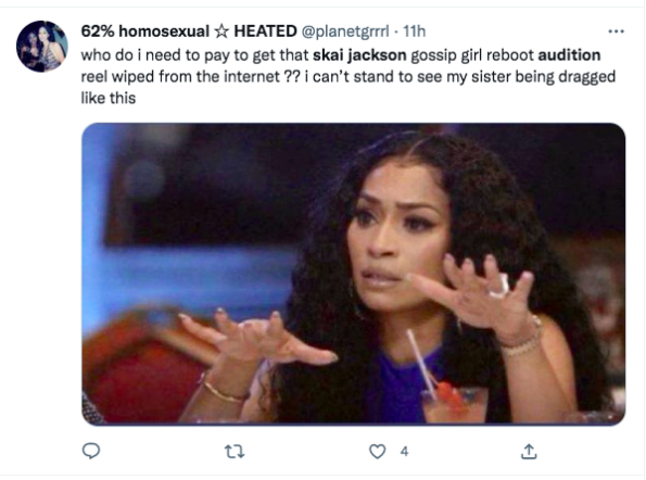 “who do i need to pay to get that skai jackson gossip girl reboot audition reel wiped from the internet ?? i can’t stand to see my sister being dragged like this”