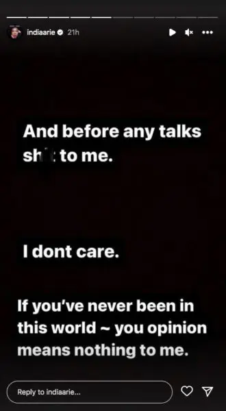 “And before any [one] talks sh*t to me. I don’t care. If you’ve never been in this world–your opinions means nothing to me.”