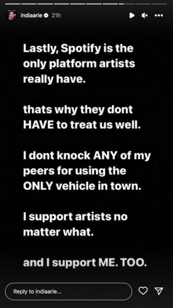 “Lastly, Spotify is the only platform artists really have. That’s why they don’t HAVE to treat us well. I don’t knock ANY of my peers for using the ONLY vehicle in town. I support artists no matter what. And I support ME. TOO.”