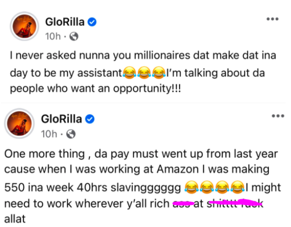 “One more thing , da pay must went up from last year cause when I was working at Amazon I was making 550 ina week 40hrs slavingggggg I might need to work wherever y’all rich a** at shi**** f*ck allat”