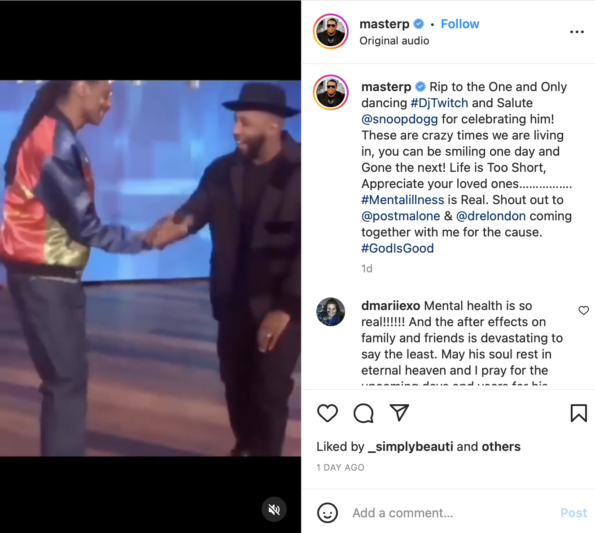 “Rip to the One and Only dancing #DjTwitch and Salute @snoopdogg for celebrating him! These are crazy times we are living in, you can be smiling one day and Gone the next! Life is Too Short, Appreciate your loved ones……………. #Mentalillness is Real. Shout out to @postmalone & @drelondon coming together with me for the cause. #GodIsGood”