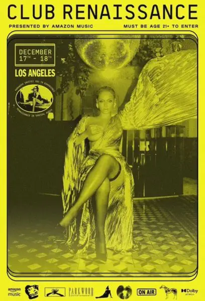 According to reports, tickets sold out in minutes, which doesn’t come as a shock to fans. Club Renaissance, presented by Amazon Music, is set to take place on Saturday (Dec. 17) and Sunday (Dec. 18). Doors will open at 8:15PM followed by a start time of 9PM. The flier features a photo of Beyonce from her seventh studio album of the singer sitting beneath a disco ball and holding her breast.