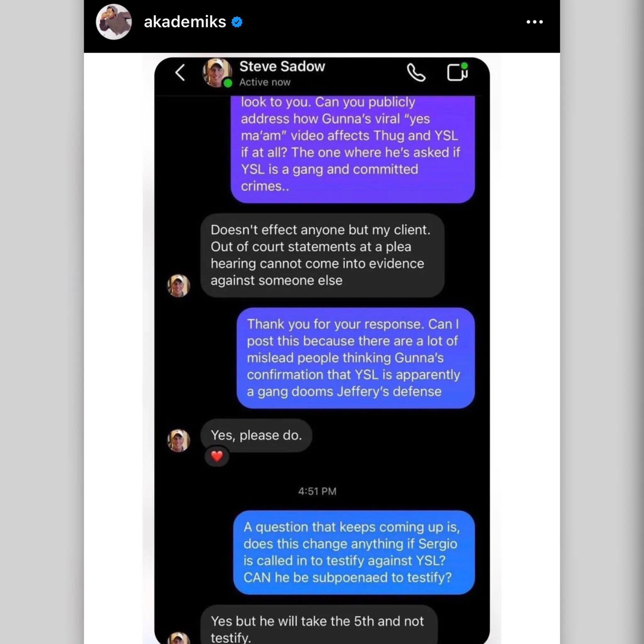 In an Instagram conversation with DJ Akademiks, Steve Sadow expressed Gunna’s statements during his hearing don’t (at all) impact Thug.