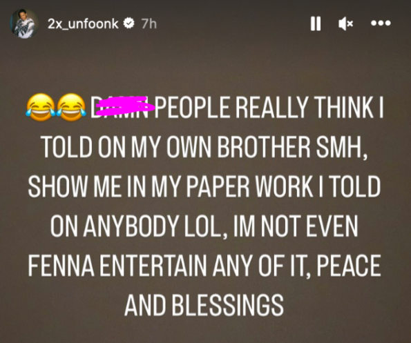 “[laughing emojis] D*MN PEOPLE REALLY THINK I TOLD ON MY OWN BROTHER SMH, SHOW ME IN MY PAPER WORK I TOLD ON ANYBODY LOL, IM NOT EVEN FENNA ENTERTAIN ANY OF IT, PEACE AND BLESSINGS”