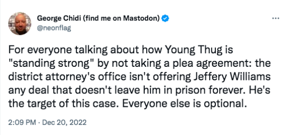 Young Thug has yet to be released from prison. According to Atlanta-based reporter George Chidi, it’s unlikely that the “Special” rapper will be offered a plea deal because prosecutors view him as “the target of this case.”