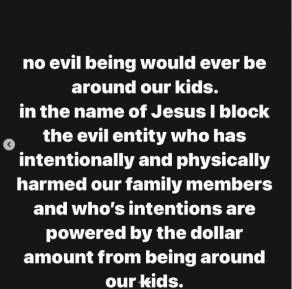 “No evil being would ever be around our kids. In the name of Jesus I block the evil entity who has intentionally and physically harmed our family members and who’s intentions are powered by the dollar amount from being around our kids.”