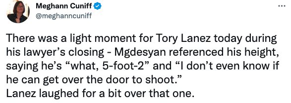 “There was a light moment for Tory Lanez today during his lawyer’s closing – Mgdesyan referenced his height, saying he’s “what, 5-foot-2” and “I don’t even know if he can get over the door to shoot.” Lanez laughed for a bit over that one.”