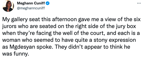 “My gallery seat this afternoon gave me a view of the six jurors who are seated on the right side of the jury box when they’re facing the well of the court, and each is a woman who seemed to have quite a stony expression as Mgdesyan spoke. They didn’t appear to think he was funny.”