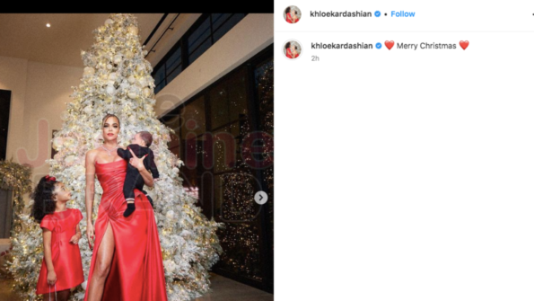 Earlier today (Dec. 26) Khloé Kardashian, 38, took to Instagram to share family Christmas photos with her 285 million followers. In the stunning images, the mother-of-two wears a floor-length red gown that features an upper-thigh slit as she poses with daughter True Thompson, 4, and her 5-month-old son in front of a beautifully decorated white Christmas tree.
