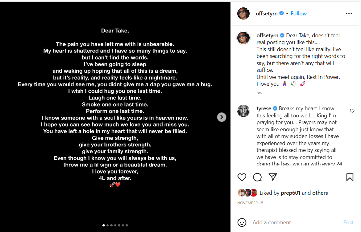 The “tough time” he was seemingly referring to during his acceptance speech is the recent loss of his cousin/Migos group member Takeoff. The 28-year-old was shot and killed in Houston, Texas on November 1st. Offset has been honest with fans about how Takeoff’s death has impacted him.