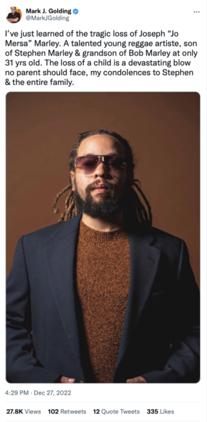 “I’ve just learned of the tragic loss of Joseph “Jo Mersa” Marley. A talented young reggae artiste, son of Stephen Marley & grandson of Bob Marley at only 31 yrs old. The loss of a child is a devastating blow no parent should face, my condolences to Stephen & the entire family.”