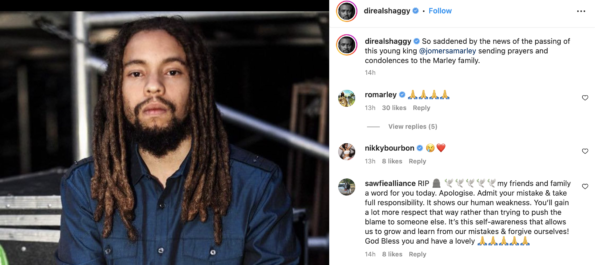 “So saddened by the news of the passing of this young king @jomersamarley sending prayers and condolences to the Marley family.”