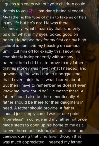 “I guess ten years without your children could do this to you. I am done being silenced. My father is the type of man to fake as of he’s in my life but he’s not. He was there “financially” what I mean by that is he only paid for what in my eyes looked good on paper. He helped pay for my first car, my high school tuition, and my housing on campus until I cut him off for exactly this. A father should just simply care.”