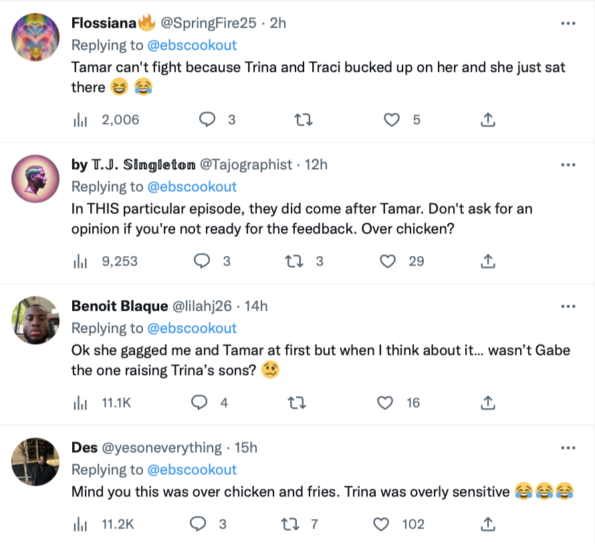 “In THIS particular episode, they did come after Tamar. Don’t ask for an opinion if you’re not ready for the feedback. Over chicken?”