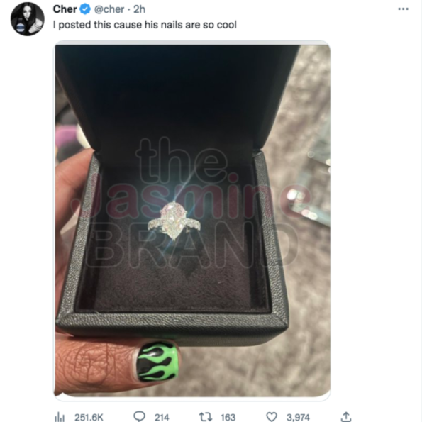 Despite not clarifying the significance behind the ring, Cher did explain that she shared the news of the gift online because she wanted the world to see her boyfriend’s “cool” nails, as he’s the one holding the ring box in the image. In a follow-up tweet, she said,