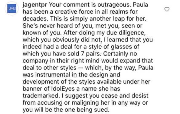 “Your comment is outrageous. Paula has been a creative force in all realms for decades. This is simply another leap for her. She’s never heard of you, met you, seen or known of you. After doing my due diligence, which you obviously did not, I learned that you indeed had a deal for a style of glasses of which you have sold 7 pairs. Certainly no company in their right mind would expand that deal to other styles – which, by the way, Paula was instrumental in the design and development of the styles available under her banner of IdolEyes, a name she has trademarked. I suggest you cease and desist from accusing or maligning her in any way or you will be the one being sued.”
