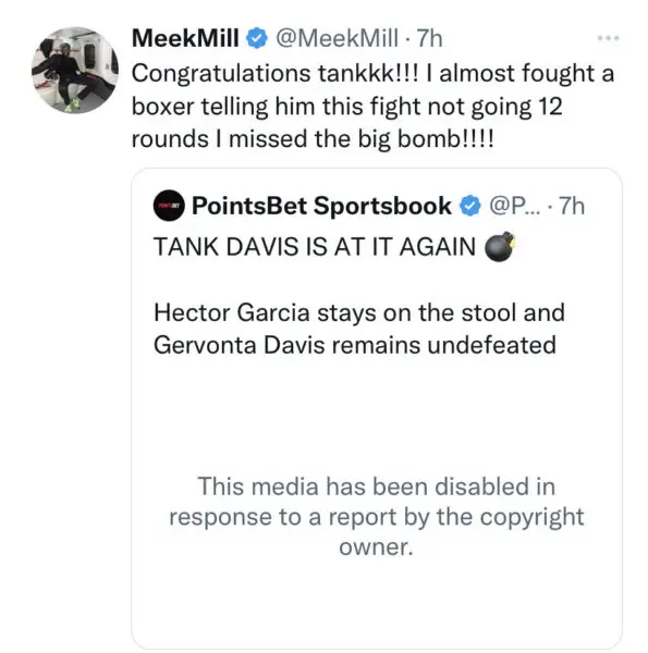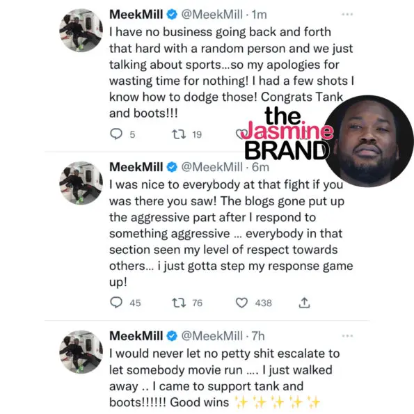 The 35-year-old musician spoke about the altercation in a series of tweets, after footage from the incident began to gain traction. Congratulating Davis, who took the win in the 9th round, Meek wrote: