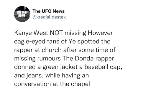 “Kanye West NOT missing. However eagle-eyed fans of Ye spotted the rapper at church after some time of missing [rumors]. The Donda rapper donned a green jacket, a baseball cap, and jeans while having [a] conversation at the chapel.”